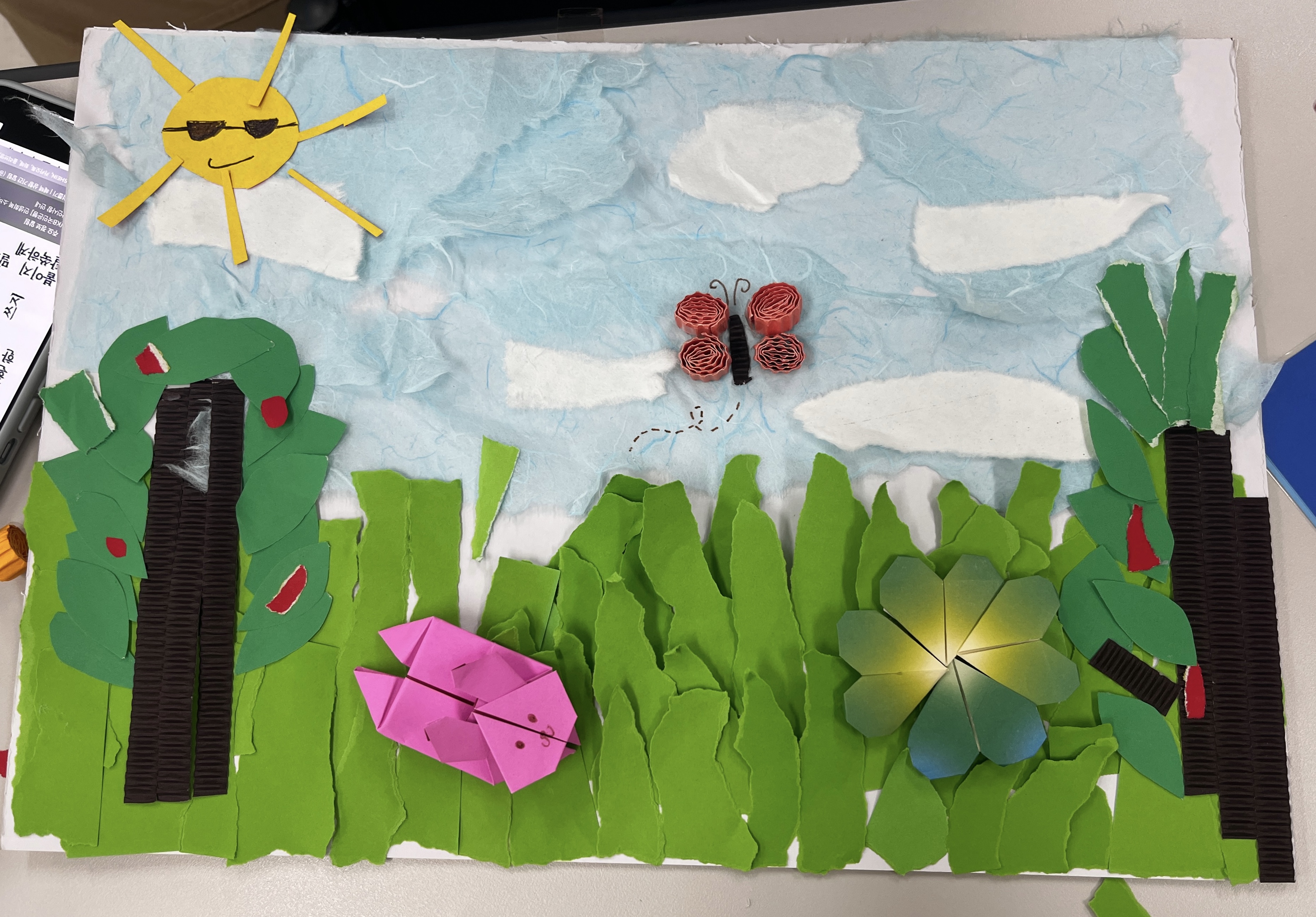 하늘색 한지와 흰 색 한지를 찢어 한지 특유의 나풀거리는 느낌을 그대로 살리며, 구름과 하늘을 표현했으며, 토끼와 네잎클로버를 접어 울창한 숲속의 모습을 표현해보았습니다.