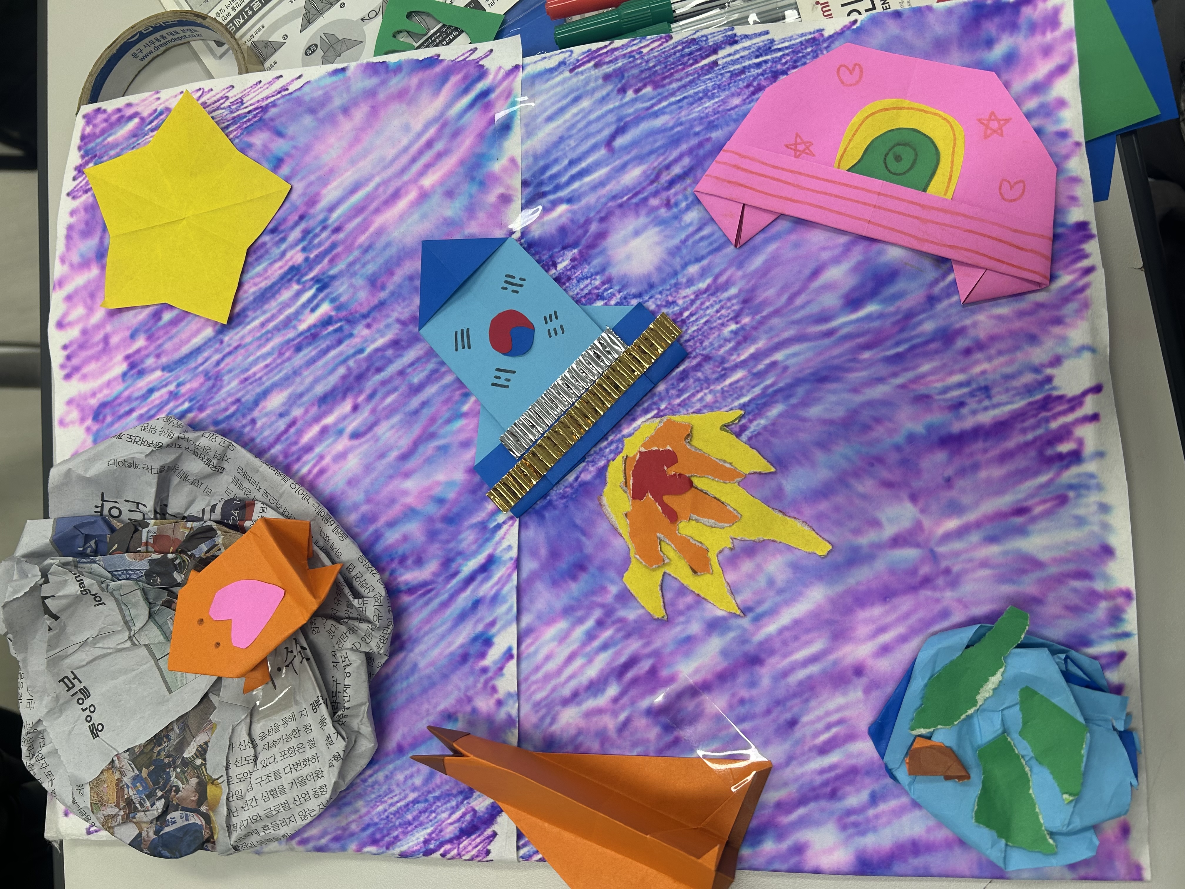 한지에 수성 싸인펜으로 선을 긋고, 물뿌리개를 이용해서 잉크가 번지도록 하는 기법을 통해 오묘한 우주 속 모습을 담아냈습니다. 또한 신문지로 달을 표시하고, 우주선이나 지구를 접어만들었습니다.