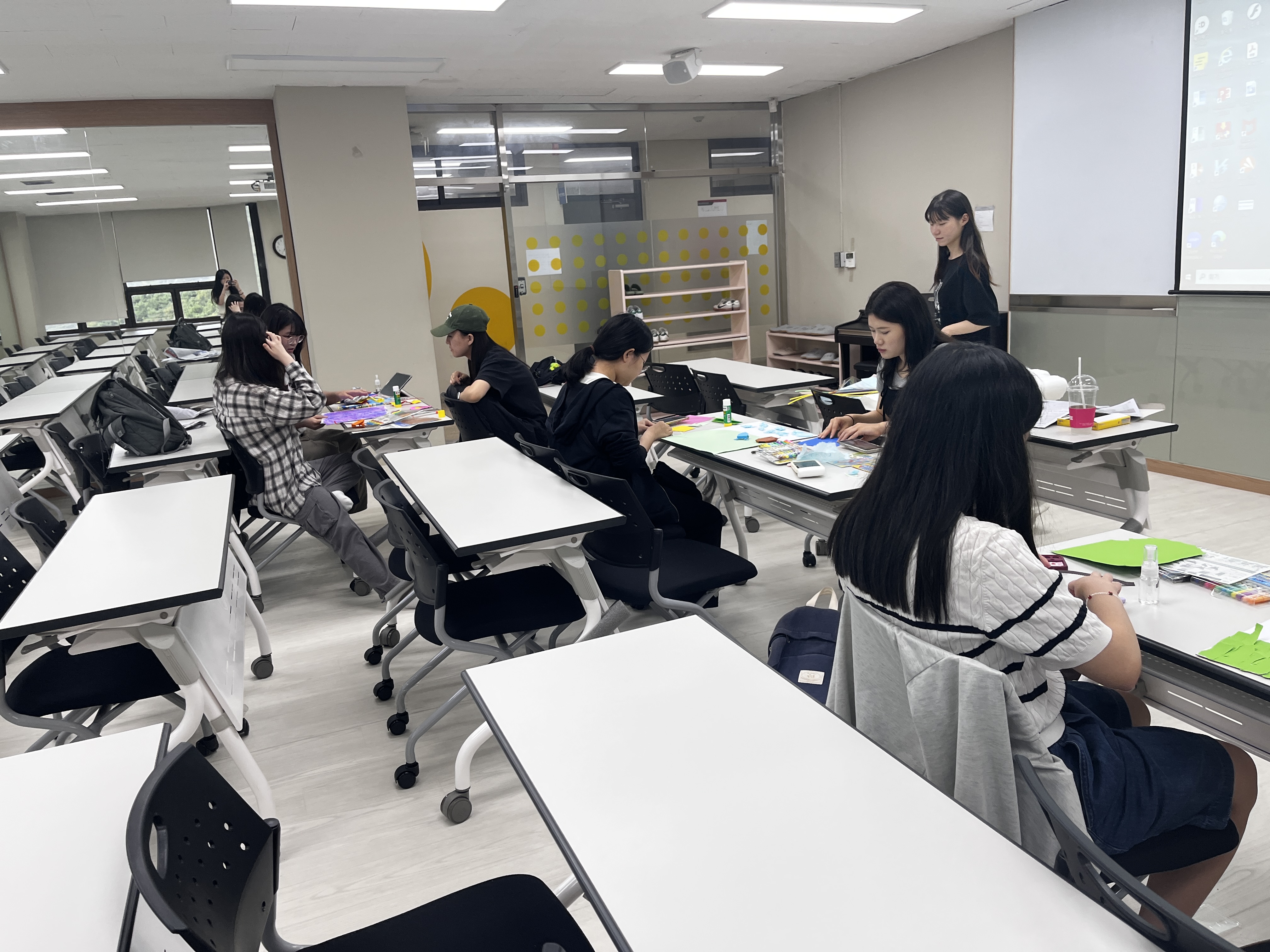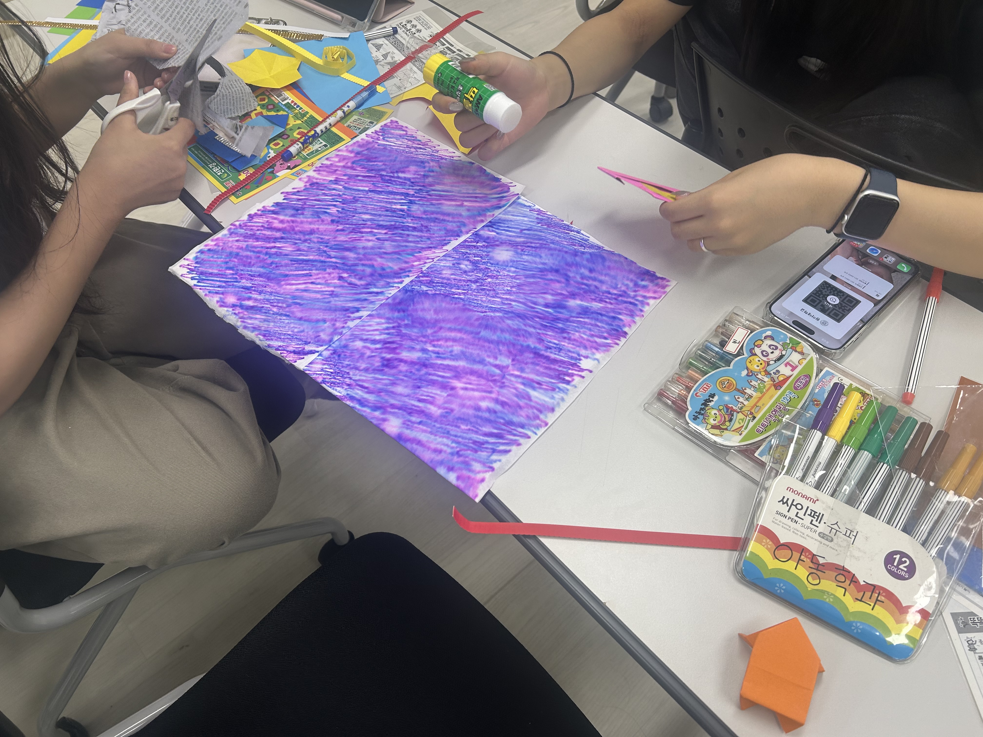 색종이를 활용해 종이 접기를 하거나 한지를 찢어 붙이고, 신문지를 구겨 입체감을 표현해보기도 하며 아이들에게 어떤 도움이 되는지 생각해보았습니다. 이후에는 모둠의 작품을 돌아가며 발표하였습니다.