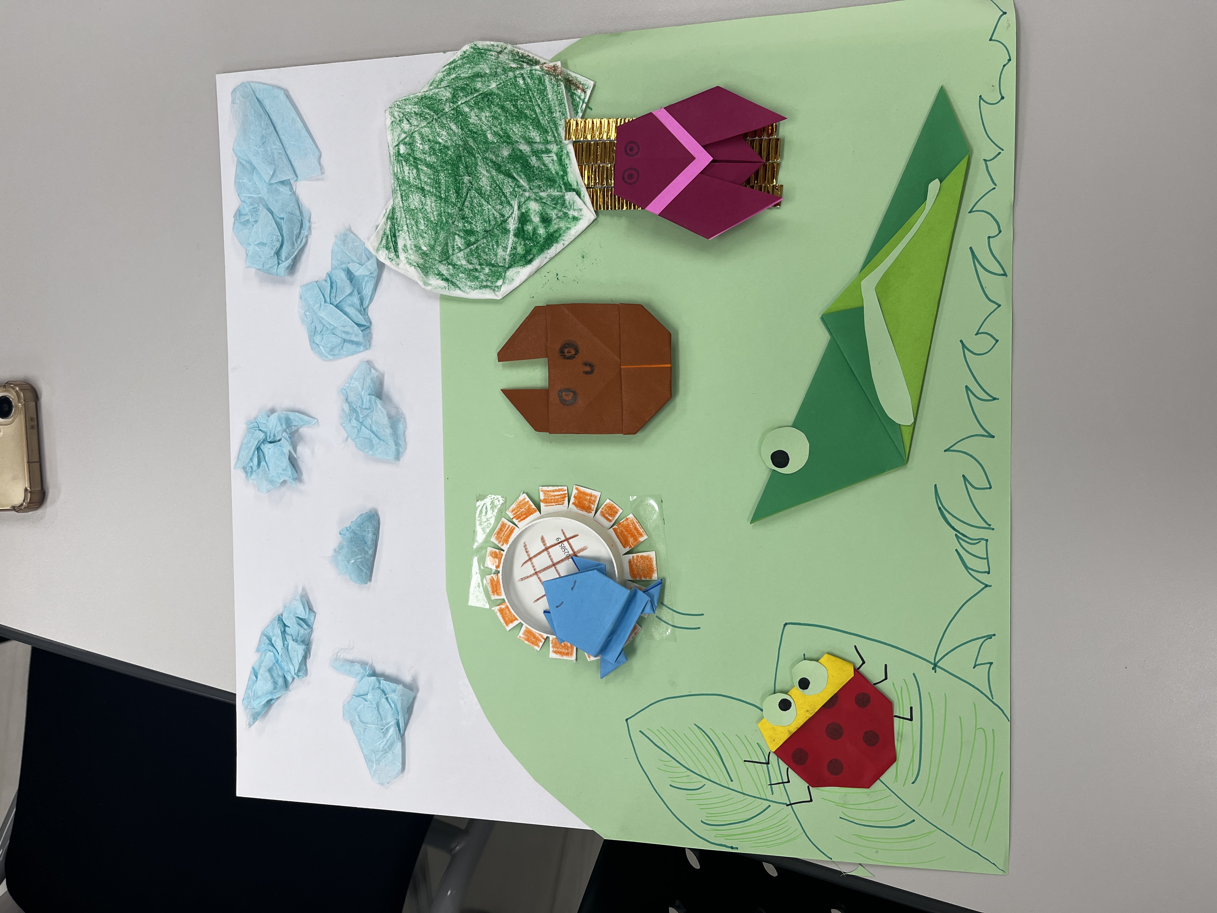이 조는 종이컵의 뒷부분을 잘라 해바라기 를 표현했습니다. 그리고 다양한 곤충들을 종이로 접어 여름날 풀숲을 표햔했습니다.