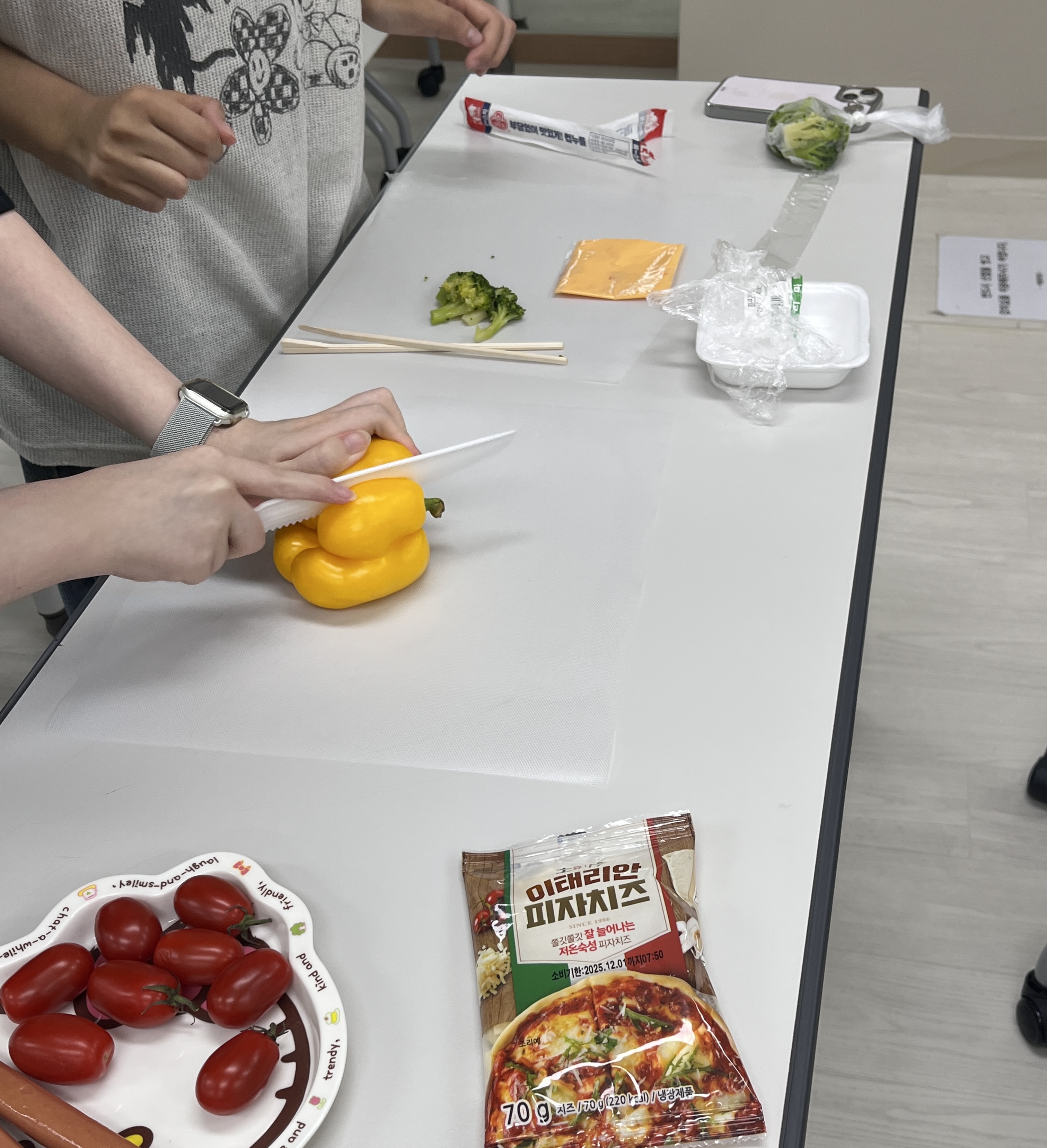 맛있는 식빵 위에 토마토 소스를 바르고 치즈 밑에 아이들이 볼 수 없게끔 숨기고 치즈 위에 소세지와 함께 노란색 파프리카를 길쭉하게 잘라 꾸며 피자를 요리해 보았습니다. 그리고 크래커 위에 토마토, 햄, 오이를 잘라 올리고 위에 동물, 꽃, 표정 등 다양하고 귀여운 모양으로 자른 체다치즈로 장식을 해서 채소를 싫어 하는 아이들도 재밌고 즐겁게 먹을 수 있는 까나페를 만들었습니다.