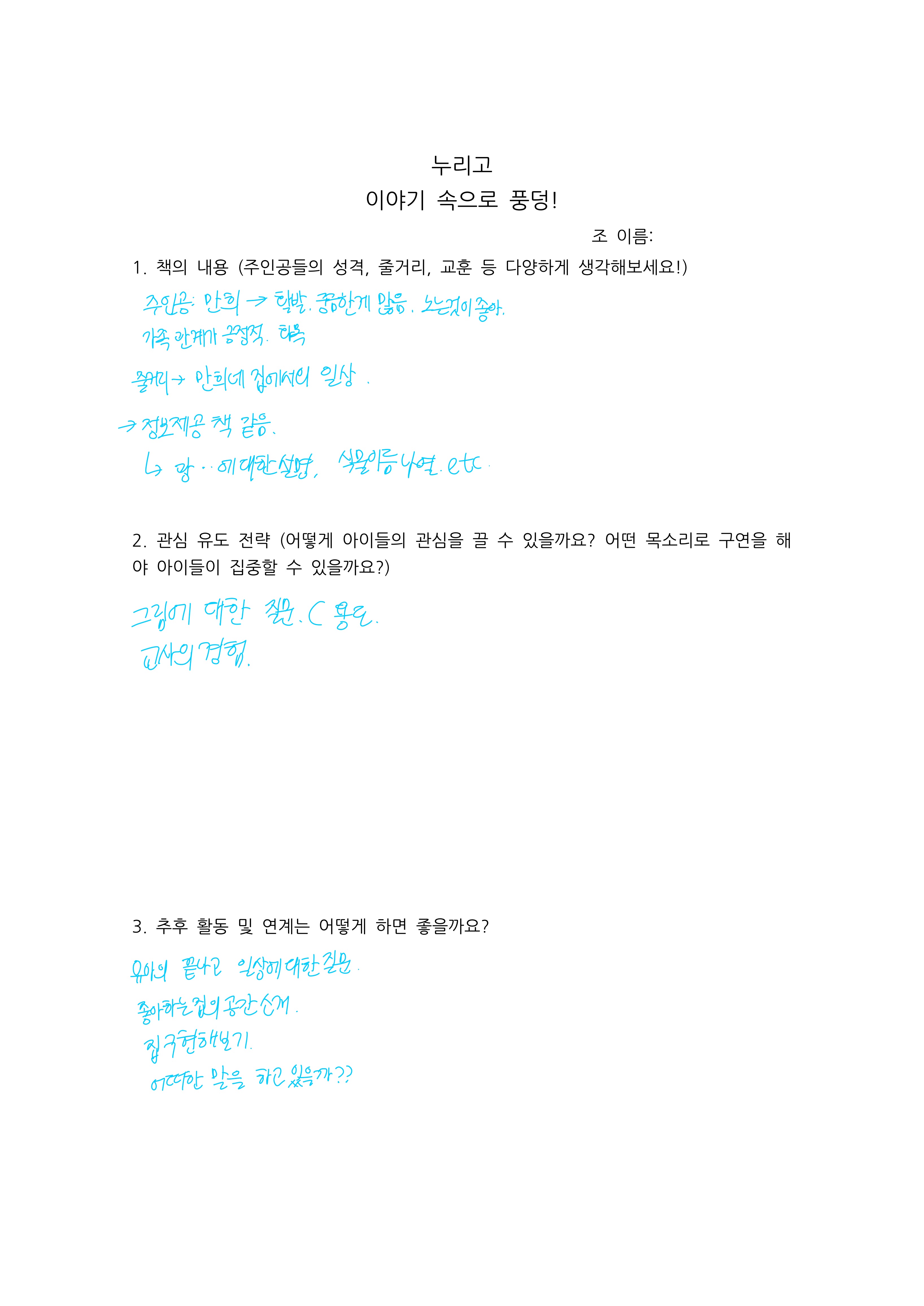 이후 어떤 방식으로 동화의 흥미를 유발할지 전략을 세워보고, 동화와 연계하여 추후에 할 수 있는 활동에 대해 이야기한 후 다른 조 구성원들에게 발표를 해보았습니다.