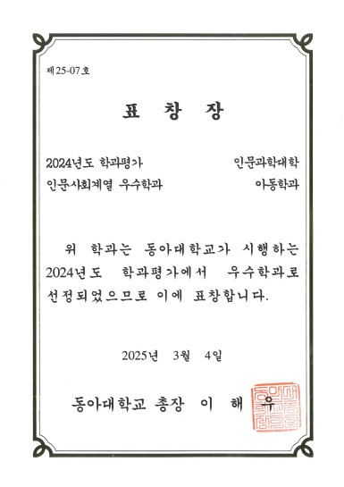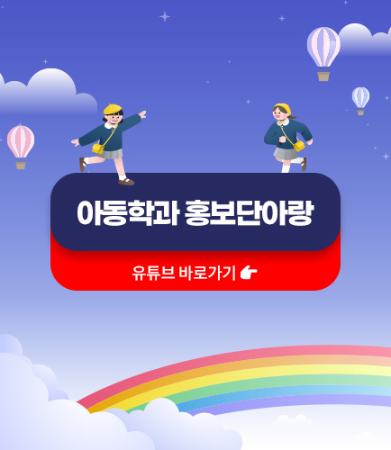 메인비주얼 동아대학교 아동학과 따뜻한 인성과 미래역량을 가진 예비아동전문가, 도전하며 소통하는 인재 양성! 이전 장면 1 다음 장면 정지 재생 팝업존 1 이전 장면 정지 재생 다음 장면 학과소개 교과과정 자격증 입학안내 취업지원실 교수진 채용정보 뉴스레터 새로운 소식 공지사항 더보기 아동학과 행사 더보기 졸업생 취업현황 더보기 학과소개 Department of Child Studies 동아대학교 아동학과는 아동을 사랑하는 따뜻한 인성과 아동 발달 및 교육, 아동심리 및 상담에 관한 전문적 역량을 바탕으로 건강한 아동과 가족의 삶을 위해 도전하고 소통하는 인재를 양성합니다. 학과소개 바로가기 학과 유튜브 이전 장면 다음 장면 학과소개